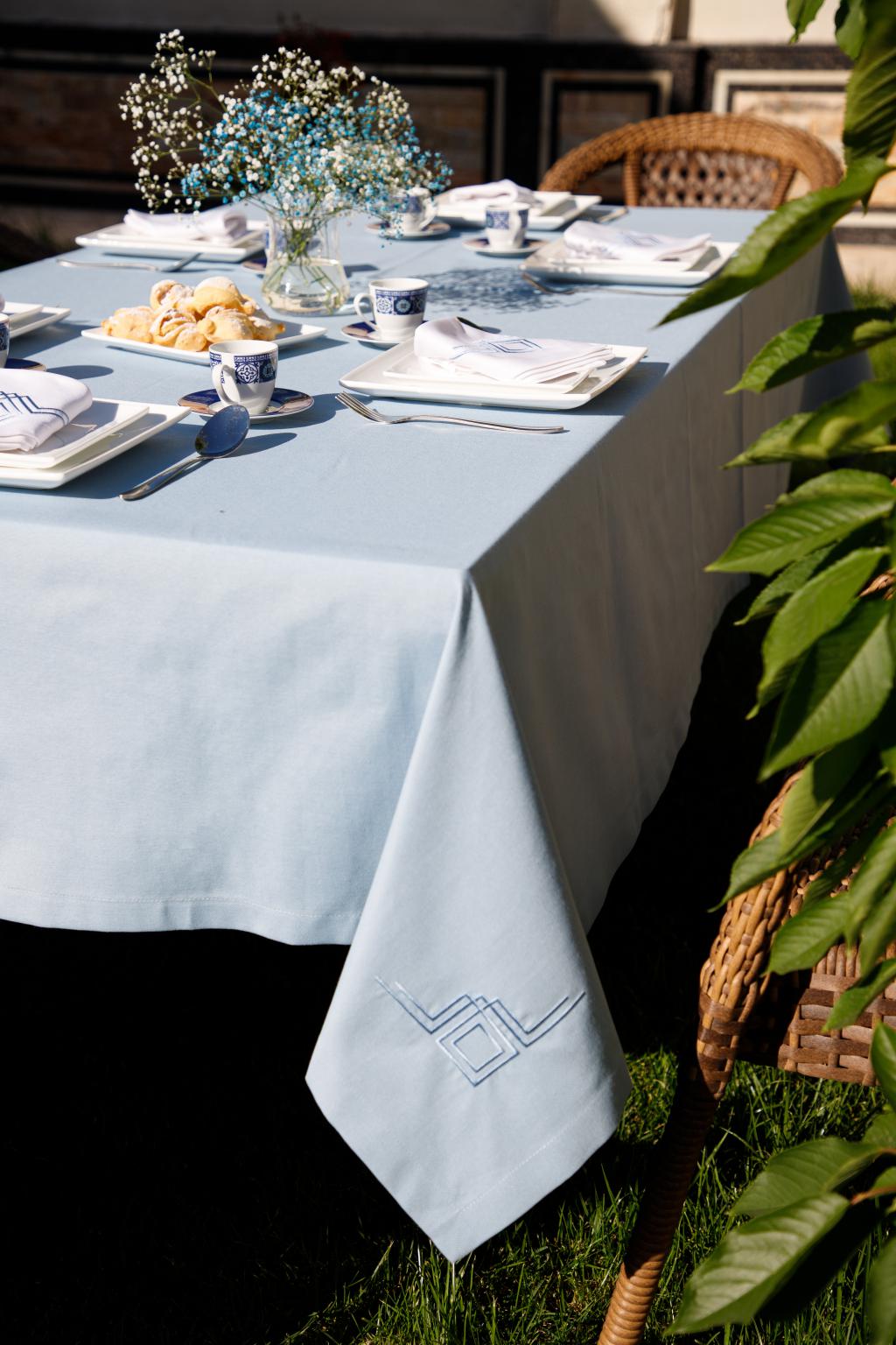 Небесно-голубая скатерть создаёт просторную и изысканную атмосферу для больших встреч за столом. Идеальна для приёма гостей и праздничных ужинов.