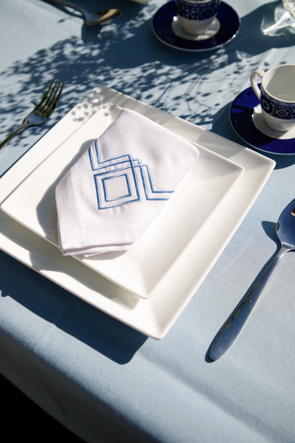 Белоснежные салфетки с изящным синим узором подчеркивают стиль и гармонию сервировки.